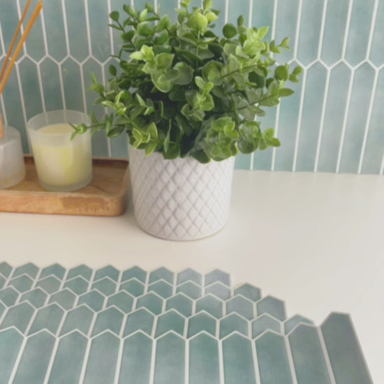 Disse turkisblå fliseklistermærker fanger øjet med deres elegante, forlængede sekskantede mønster, der giver en illusion af skummende bølger. Farven og formen sammen skaber en beroligende, men samtidig levende atmosfære, der passer perfekt ind i ethvert rum, der trænger til et pust af kystinspireret friskhed.